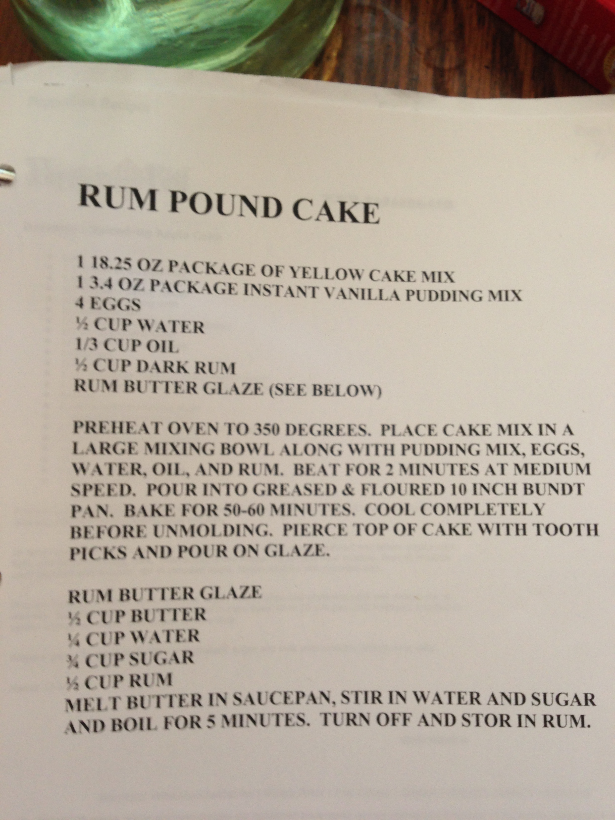 The great thing about this rum cake recipe is that the alcohol part of the rum cooks out and leaves the great rum flavor. The recipe calls for dark rum and we keep light rum in the house, so that is what I used.