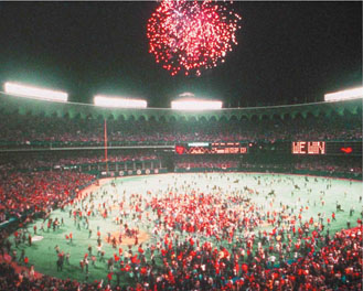 Why that game? The Cardinals were underdogs. The Brewers were the mighty powerful Harvey Wallbangers with their 216 homeruns while the Cardinals only had 67. Whiteyball was the Cardinals mantra. That was solid pitching, great team defense, aggressive base running, and all around manufacturing runs. This was a Midwestern city battle World Series. They referred to the series as the Suds Series since both towns were huge beer producers. The Cardinals swept America’s team, the Atlanta Braves to get to the Series. I wanted to be there in person to see the marquis on the scoreboard that made me cry as a boy. It simply said ‘WE WIN’.